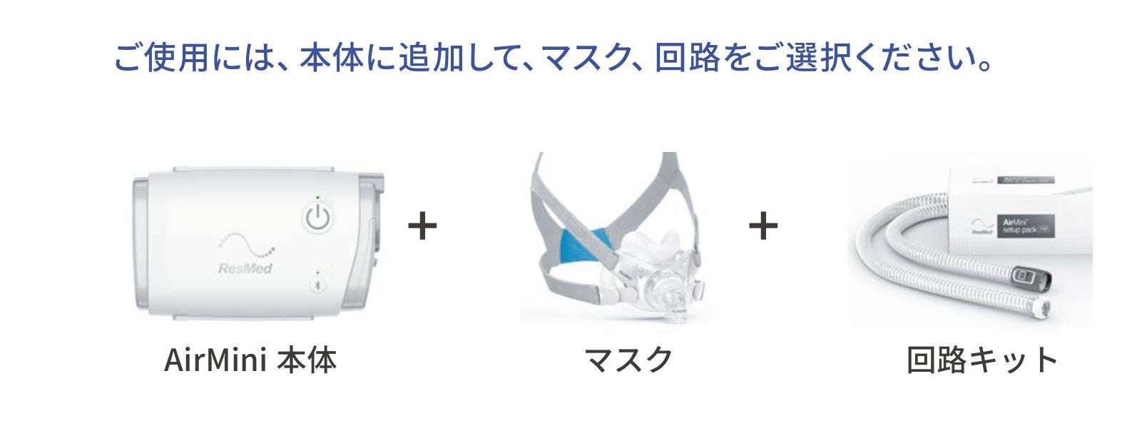 AirMini 本体のみでは治療を開始できません。使用するマスクに応じて、以下を合わせてご購入ください。