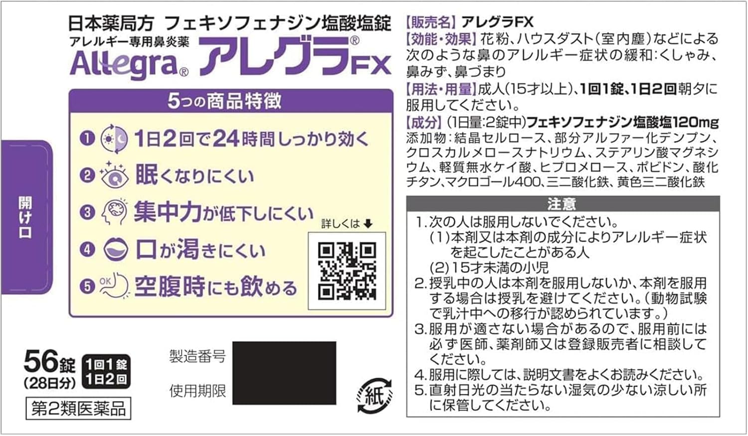 アレグラFXは、有効成分フェキソフェナジン塩酸塩を含む第2類医薬品の抗アレルギー薬です。くしゃみ、鼻水、鼻づまりなどのアレルギー性鼻炎の症状に対して使用されます。