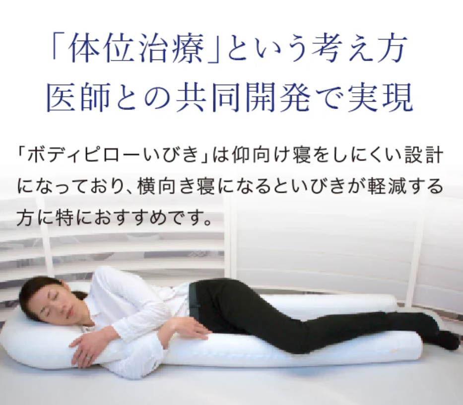 「ボディーピローいびき」は、体位療法という考え方をもとに、睡眠医学の権威とLOFTYが共同開発したボディーピローです。