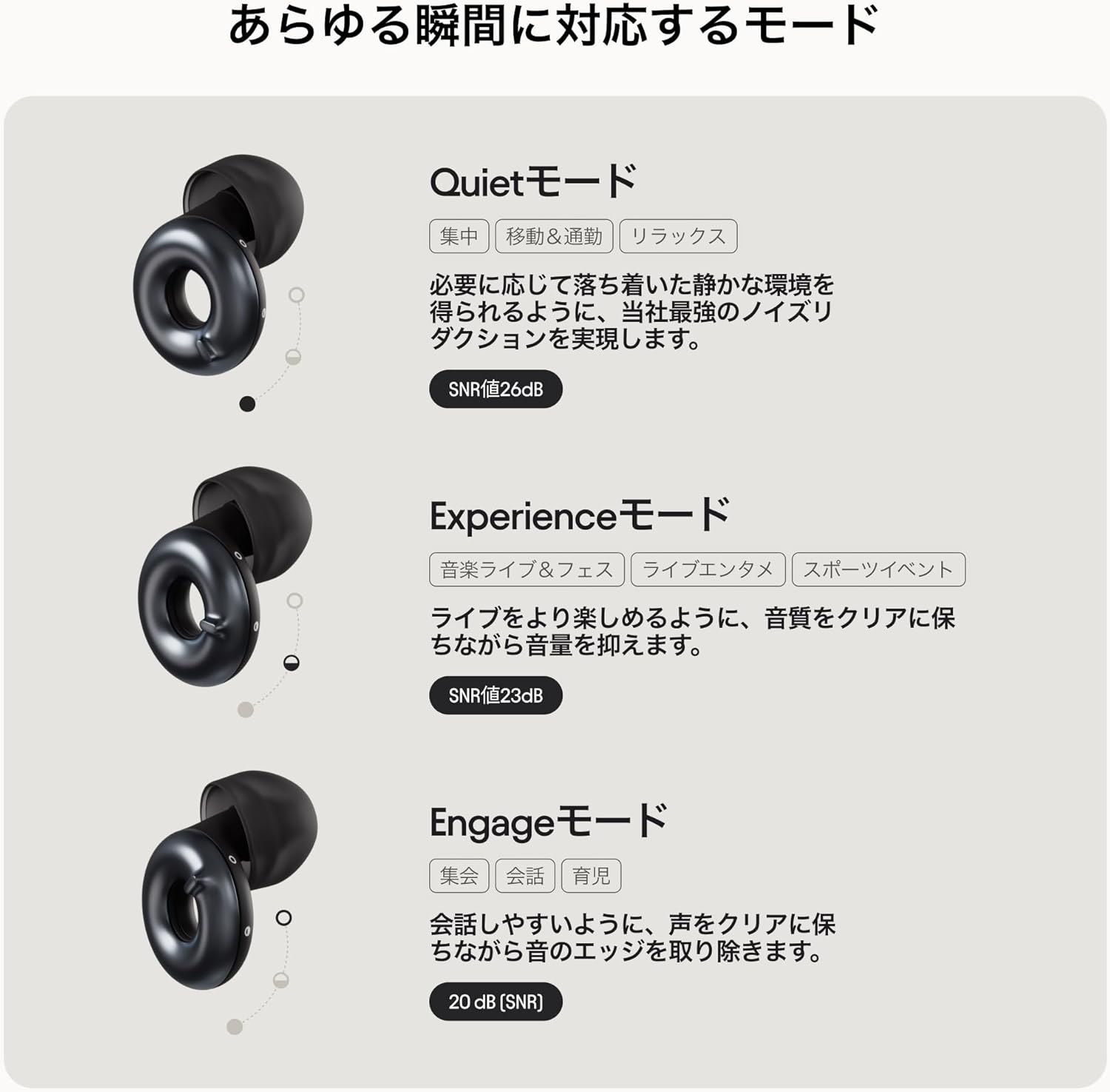 側面のダイヤル操作により、「Quiet」「Experience」「Engage」モードを切り替えて、どんな環境でも音量を調整可能で、1つの耳栓で複数の遮音スタイルを使い分けることができます。